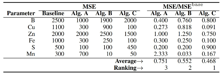 - We have three competing algorithms: Algorithm A, Algorithm B, and Algorithm C, resulting in some MSE values obtained for 6 soil parameters of interest (B, Cu, Zn, Fe, S, Mn).