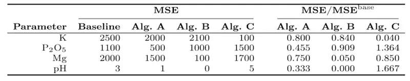 Then, Table 1 gathers the baseline MSE together with the MSE values obtained by the algorithms A – C, and divided by the baseline MSE. The baseline MSE reflects the performance of the algorithm that returns the average value of each soil parameter obtained for the training set – the implementation of this algorithm is included in the Jupyter starter pack for convenience.