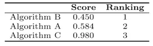 Table 2: The aggregated score obtained for three competing algorithms A – C, together with the corresponding ranking. Algorithm B is the winner.